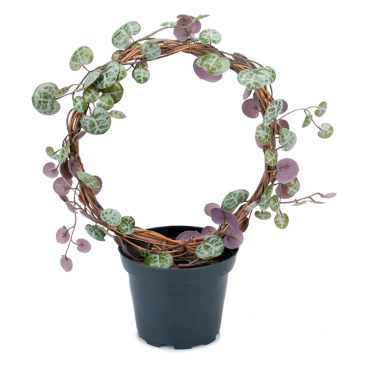 Väldigt hjärtan på tråd på rund båge. I svart innerkruka i plast. Naturtrogen konstgjord blomma som har evig livslängd!