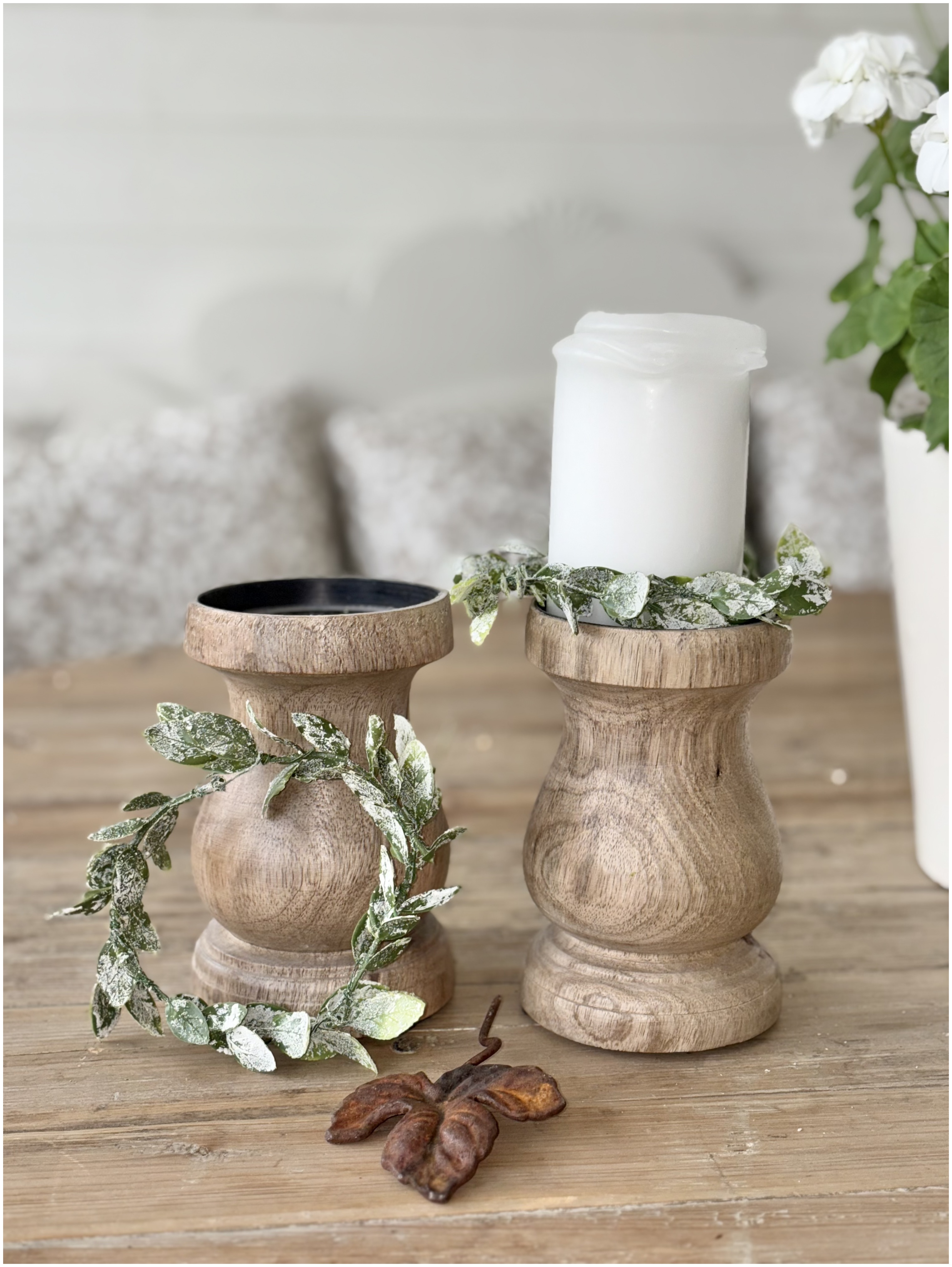 Vacker kransformad ljusmanschett med vitgröna blad. Naturtrogen konstgjord ljusmanschett som har evig livslängd! Passar bra till blockljus eller knyt ett band runtom den och hängd den på tex en skåplucka.