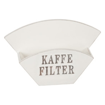 Praktisk vit hållare för kaffefilter med texten Kaffefilter. Nu behöver du inte längre gömma dina kaffefilter utan kan med glädje få låta dem synas i denna fina hållare!
