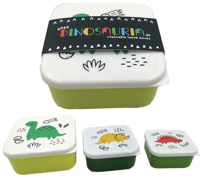 Set om 3 st plastlådor med dinosaurie motiv. Ett roligt inslag för barnens måltider. Passar perfekt till mellanmålet eller picknicken! Lådorna går att stapla i varandra.