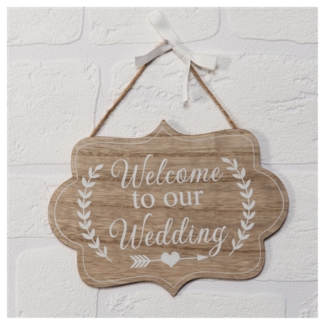 Vacker träskylt i fin tränyans textad i vitt: Welcome To Our Wedding! Vackert band för upphängning. Ljuvlig bröllopsdekoration som är en fin detalj på bröllopet.